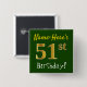 Este sencillo diseño de botón cuadrado muestra un mensaje como "¡Nombre: ¡Este es el cumpleaños número 51!", con el "51" con un aspecto de color falso/imitación de oro, en un fondo de color verde. El nombre se puede personalizar. Botones como este podrían ser usados por los invitados en una fiesta de cumpleaños para alguien que está celebrando su primer cumpleaños, donde el fiesta está siendo retenido en un gran área con muchas otras personas presentes (como un parque de la ciudad o un parque temático). [~Z0000163]