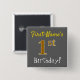 Este sencillo diseño de botón cuadrado muestra un mensaje como "¡Primer cumpleaños!", con el "primero" con un aspecto de color falso/imitación dorado, en un fondo de color gris (gris). El nombre se puede personalizar. Botones como este podrían ser usados por los invitados en una fiesta de cumpleaños para alguien que está celebrando su primer cumpleaños, donde el fiesta está siendo retenido en una gran zona con muchas otras personas presentes (como un parque de la ciudad o un parque temático). [~Z0000192]