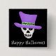 Gran pin de insignia de "Halloween feliz" para usar en Halloween a un fiesta u otras funciones. Esta insignia tiene un cráneo de esqueleto con un sombrero violeta. Puedes personalizar las palabras "Halloween feliz" a otras palabras debajo del cráneo. Fantástico para festividades de Halloween, fiestas y uso general Este cráneo vino de arte original pintado a mano con tres esqueletos bailarines con un sombrero de top púrpura en sus cráneos y está en los colores negro, blanco y morado. Consulta mis otros productos con este arte para ver productos en goulish para Halloween incluyendo tarjetas de felicitación, camisetas, posters, calcomanías, fundas de dispositivos electrónicos y más. Personalizable completo para la personalización. El arte original es de Phyllis Dobbs que te desea una Halloween feliz y honesta.