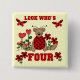 Una mariquita de oso de peluche, flores de corazón rojas y texto que dice "Mira quién es cuatro" en un lindo diseño de cuarto cumpleaños con camisetas de cuarto cumpleaños, tazas, tarjetas, pegatinas y más.