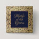 Este botón de boda azul elegante para la madre del novio, con un aire vintage, tiene un marco dorado antiguo con decoraciones de rosas silvestres doradas que rodean un cuadrado azul marino con el texto dentro. El título "Madre del novio" está escrito en una elegante letra caligráfica. El texto se puede personalizar y tiene un color dorado similar a las decoraciones doradas del marco. El marco dorado antiguo con rosas silvestres es de una cubierta de libro antiguo de 1912, de las Obras Poéticas Completas de Geoffrey Chaucer, ahora en el dominio público.