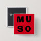 Un botón con un simple diseño de texto de la palabra 'muso', que significa músico. Las letras mayúsculas están en negro sobre un fondo rojo vibrante.