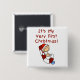 Un adorable bebé con una figura de bastón usando un pañal y una gorra de caldo roja descansa sobre el ladrón de un bastón de caramelo y el texto rojo dice "¡Es mi primera Navidad!" en las primeras camisetas de Navidad, bolsas de tote y otros equipos de vacaciones.