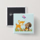 Botón con un lindo ilustracion con un venado y una pequeña ardilla sosteniendo una bellota y una mariposa volando sobre sus cabezas. Estas adorables criaturas de los bosques sobre el césped con algunos hongos extravagantes a sus pies. Fondo azul claro.