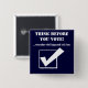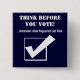 Un divertido botón político que dice "¡Piensa antes de votar!" en negrita y blanco sobre fondo azul profundo, y debajo "...recuerden lo que pasó la última vez". Personalizable.