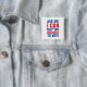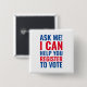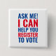 Pregúntame que puedo ayudarte a inscribirte para votar el botón de voluntario de las elecciones políticas patrióticas en rojo y azul. Texto rojo y azul sobre fondo blanco.