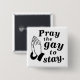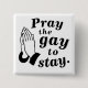 Botón cuadrado en un fondo blanco con texto negro y ilustracion. El ilustracion está en la parte inferior izquierda y es de las manos en oración. A la derecha de las manos, en la letra curva serif, se lee: "Reza al gay para que se quede".