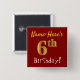 Este sencillo diseño de botón cuadrado muestra un mensaje como "¡Nombre-Aquí es el sexto cumpleaños!", con el "sexto" con un aspecto falso/imitación de color dorado, en un fondo de color rojo. El nombre se puede personalizar. Botones como este podrían ser usados por los invitados en una fiesta de cumpleaños para alguien que está celebrando su sexto cumpleaños, donde el fiesta está siendo retenido en una gran zona con muchas otras personas presentes (como un parque de la ciudad o un parque temático). [~Z0000163]
