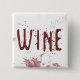 Texto decorativo del vino o palabra de color rojo oscuro o burdeos y manchas y manchas rojas oscuras que imitan las manchas del vino. Impresiones y regalos para diversión y buen humor. botón Gracioso