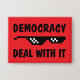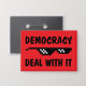 Funny political button for democracy lovers who vote the issues. Upbeat and irreverent Dom casual Font with 8-bit meme deal with it glasses. Black font. Funny pro democracy sticker for America.