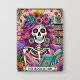 Diseño vibrante y colorido con una graciosa tarjeta de tarot con esqueleto femenino. El esqueleto tiene el pelo rosado salvaje con flores en él, una cara de cráneo de azúcar, y está sosteniendo un libro abierto. El colorido texto dice: "El ratón de biblioteca". Este diseño está disponible en una amplia variedad de productos.