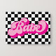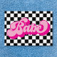 Crea tu propia tipografía de estilo retro rosa caliente y rosa "Babe" contra un patrón de tablero de ajedrez de personalizable en un botón rectangular de respaldo para tu fiesta de soltera. Puede cambiar los cuatro colores de los gráficos vectoriales para que coincidan con los colores de la paleta boda. Personalizar con texto del sistema para crear su propio diseño personalizado.