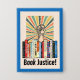 Protesta prohibiendo libros con esta imagen que muestra una estantería de libros prohibidos, un puño levantado en protesta, un estallido de rayos de color y las palabras "Justicia del libro" en un tipo de letra retro. Acentuado por un borde de azul rico. ¡Parece genial!