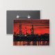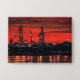 En este paisaje acuático industrial, el cielo está inundado de rojo después de una brillante puesta de sol en Portland, Maine. Los derrricks de petróleo en construcción crean siluetas duras contra los brillantes rojos y naranjas. Puntos de luz que se reflejan en el agua del océano mientras el trabajo continúa por la noche.
