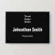 ¿Está buscando botones personalizados para sus uniformes de empleados? Puede reemplazar la imagen de pantalla con el logotipo de su empresa. Este botón negro contiene dos líneas de texto en blanco. Puede editar el texto para mostrar el nombre del empleado y el título del trabajo.