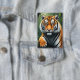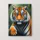 A striking tiger gazes forward with intense amber eyes, resting a paw on a log. Lush green foliage surrounds the scene, creating a vibrant jungle setting.