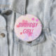 Personalizable "¡Chica de cumpleaños!" botón con texto en una letra en negrita de chicle rosa sobre flores rosadas y de chile, todo sobre un fondo rosa violeta al champán rosa de fondo de ombré, con un círculo blanco conteniendo.