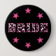 Celebra a las futuras novias con estos botones de despedida de soltera con tema de vaquera disco. Este botón presenta la palabra NOVIA escrita en letras con patrón de cuero de vaca en blanco y negro sobre un fondo negro con acentos de estrellas rosadas.