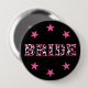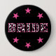 Celebra a las novias con estos botones de fiesta de despedida de soltera con tema de disco vaquera. Este botón presenta la palabra NOVIA escrita en letras con patrón de cuero de vaca en negro y blanco sobre un fondo negro con acentos de estrellas rosadas.