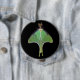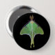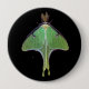 Este botón presenta la increíble luna luna, una polilla de color verde lima, Saturnida nearctica en la subfamilia Saturniinae. Con una envergadura de hasta cuatro pulgadas y media, esta hermosa criatura se ubica como una de las más grandes polillas en Norteamérica. Esta polilla adulta acaba de salir del capullo y está esperando en la corteza de un tronco de árbol para secarse y endurecerse. Los adultos no comen ni tienen bocas. Viven sólo una semana y emergen como adultos sólo para aparearse. Con un color verde limón y ojos distintivos, este es un ser de aspecto mágico y misterioso.