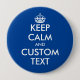 Personalizado Mantenga calmados los enormes botones de fondo azul redondo. Crea tu propio chistoso Mantente tranquilo y sigue con la parodia. Alfiler de gran tamaño con tipografía moderna y corona. diseño de plantilla de personalizable. Se pueden cambiar todos los colores. Diversión por fiesta de cumpleaños, evento, negocios, boda, etc. Idea de regalo de humor de oficina.