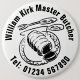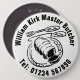 botón Carnicero Ver con tu elección del nombre de la compañía y número de teléfono. El ilustracion muestra un trozo de carne.