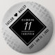 ¡Celebra el 11º aniversario de los bodas de acero con este elegante botón! Las elegantes letras en blanco y negro sobre un fondo de acero gastado y chapado en diamante añaden un toque memorable a esta ocasión especial y a este hito. Personaliza con los nombres y fechas de matrimonio de la pareja. Diseño © W.H. Sim. Ver más en zazzle.com/expressionsoccasions