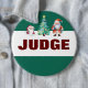 Navidades etiqueta con el nombre temático botón Juez con el lindo gnomo, árbol de Navidad y Santa . Botón Juez perfecto para ferias y eventos de Navidades. Ideal para juzgar concursos para la temporada de fiestas.