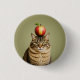 Un gato gracioso con una manzana balanceándose encima de su cabeza.