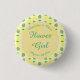 Este botón está diseñado para el chica de flores. El diseño presenta un patrón de frutas tropicales de piña amarilla con sumideros verdes y hojas de palmera verde pálido en bonito. Ideal para un Boda de verano o de temática tropical. Hay un círculo amarillo con patrones de mármol blanco en él que contiene texto de personalizable para que puedas personalizar este diseño.
