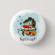 Un ilustracion divertido y moderno de una playa tropical con palmeras, océanos de surf con surfistas, una hermosa mujer vestida en bikini, hermosas flores y un viejo autobús con camioneta Hippy. Gran diseño para los amantes de la playa. Se puede personalizar la frase "¡Surf's up!".