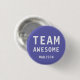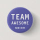 Funny Team Awesome Purple Personalized Name Button incluye el texto "Team Awesome" con tu nombre personalizado debajo en un fondo morado. Personalice editando el texto en el cuadro de texto proporcionado. Diseñado por ©Evco Studio www.zazzle.com/store/evcostudio