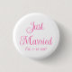 Botón Pin accesorio de moda divertido y casual con fondo de color blanco e impresión "recién casados" en tipografía de letra de color rosa intenso diseñado por TheFabricSeal tienda de impresión bajo demanda en Zazzle.com #ZazzleMade https://www.zazzle.com/store/thefabricseal TheFabricSeal Original.