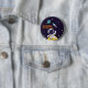 botón de niño de cumpleaños personalizado con un nombre. Diseñado con un fondo azul oscuro y estrellas amarillas diseminadas por todo el hotel. Encendido sobre la parte superior hay un ilustracion de un hombre espacial vestido con un traje de astronauta blanco flotando sobre la luna. A la distancia hay un planeta con anillos y un barco con cohetes volando hacia el cielo buscando nuevos mundos para explorar.