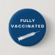 Muestre su apreciación por ser completamente vacunado contra covid-19 con este divertido botón azul que presenta "Totalmente vacunado" en una tipografía blanca simple y una jeringa para la aguja con "Covid-19" en la etiqueta.