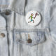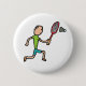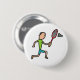 El jugador de bádminton salta y toca el lanzador hacia el otro lado de la cancha. Gráfica deportiva divertida de badminton con jugador, raqueta y lanzador todo en acción a mano completa.