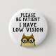 Para personas con baja visión. El texto dice: "Por favor, ten paciencia, tengo poca visión". Debajo hay una imagen de un búho con gafas.