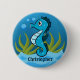 botón de insignia con un caballito de mar azul en una escena submarina. Debajo hay una plantilla para agregar su nombre a personalizar.