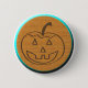 Un botón redondo de madera con un diseño de calabaza tallada en forma de linterna con un contorno azul brillante.