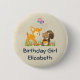Botón de chica de cumpleaños con un ilustracion lindo con un ciervo bebé y una pequeña ardilla sosteniendo una bellota y una mariposa volando sobre sus cabezas. Estas adorables criaturas de los bosques sobre el césped con algunos hongos extravagantes a sus pies. Fondo de color arena marrón