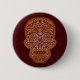 Un día elaborado del diseño muerto del cráneo del azúcar adornado con remolinos y modelos de punto complejos. Las líneas y los círculos del complejo se colorean con un marrón claro que se destaque para crear un brillo sutil en la superficie. El interior del cráneo se acaba con un rojizo que se repita en el fondo que crea un contraste hermoso. Una sombra cae apenas debajo del cráneo que lo hace aparece flotar apenas sobre la superficie del botón. Este diseño elegante es una representación llamativa de este símbolo a partir del día de los muertos.