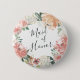 Identifique a los jugadores clave de su ducha de novia con nuestros elegantes botones florales de moda. El botón presenta una corona floral acuarela de peonías rosadas de color turquesa, flores de hortensias blancas y vegetación botánica con "doncella de honor" inscrita en el interior con escritura manuscrita.