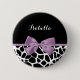 Un lindo botón de impresión en blanco y negro de jirafa con una cinta de lavanda violeta y giratoria atada en un arco femenino. Personalice esta etiqueta de nombre de impresión animal de bonito agregando su nombre. Imagen plana impresa, no arco real.