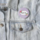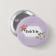 Botón de despedida de soltera con diseño floral acuarela y texto personalizable y fondo morado. Las imágenes de flores utilizadas son cortesía de freepik.