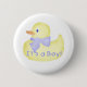 Un pato amarillo con una cinta azul y un texto azul que la lea "es un muchacho!" en los botones, los imanes, y más del bebé.
