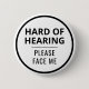 Este botón de necesidades especiales incluye el lema 'Duro de escuchar, por favor, mírenme' en negrita y negro sobre fondo blanco. También tiene un borde de círculo negro. Puede editar el texto según sea necesario y todos los colores de la herramienta de diseño de Zazzle. ⭐ Para más información sobre minusválidos, visita mi tienda: Zazzle.com/Elder_Vitality ⭐ Para pedidos de personalizados, envíame un mensaje a Zazzle