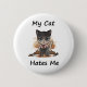 Este botón muestra un ilustracion oscuro y gracioso de un gato enfurecido, jugando con el estereotipo clásico de que los gatos están distantes, fríos o incluso abiertamente hostiles hacia sus dueños. Capta el humor de los gatos como pequeños tiranos que gobiernan la casa y toleran a los humanos solamente en sus propios términos.