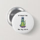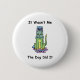 Botón con un ilustracion que muestra un gato de aspecto gruñón sentado con una taza de plástico pegado en la cabeza como un casco. Es una postura humorística, un poco sarcástica sobre los gatos, torpeza, y esos momentos "por supuesto que esto me pasaría a mí".