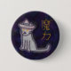 Un tierno botón de gato de bruja con la palabra japonesa para hechizo mágico.