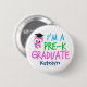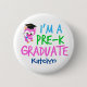 Un genial botón personalizado de graduación preescolar para una niña que se gradúa de Pre-K y pasa a kindergarten. Presenta una linda lechuza rosa con un gorro de graduación y llevando un pergamino junto a un divertido tipo de letra azul, verde y rosa.